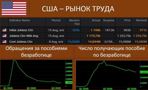 Несмотря на небольшой рост первичных обращений за пособием, количество уже получающих пособие продолжает снижаться, и уже составляет менее 15 млн человек. Вероятно, что при дальнейшем улучшении ситуации с коронавирусом, тренд на сокращение безработных будет продолжаться. На данный момент в экономике США восстановлено только 9.3 млн. из 22 млн. рабочих мест, потерянных с февраля по апрель.